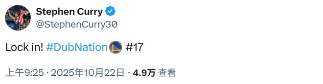 比赛开始前,库里更新了社媒动态写道:“专注!#勇士国度 #第17个赛季。”
