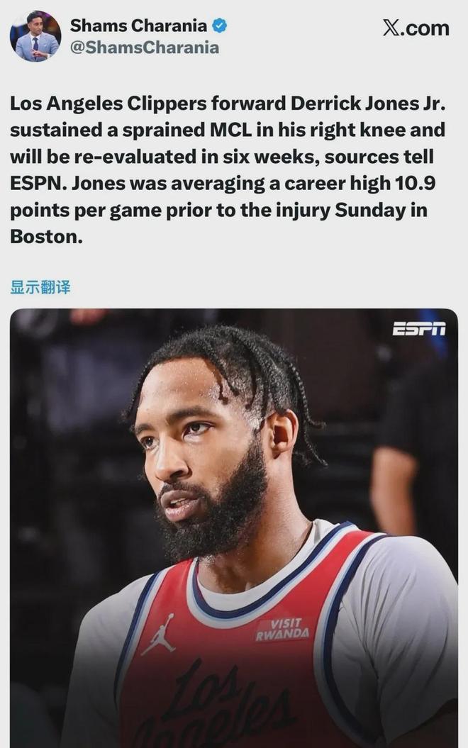 近日快船118-121惜败的比赛,杰伦布朗在扑球过程由于失去平衡砸到小琼斯的腿部,导致他出现了如上所述的重伤情况。